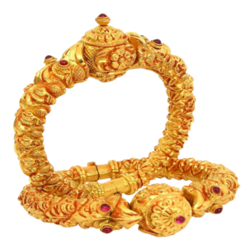 Elevate your style with this exquisite set of 22K gold designer bangles adorned with stunning red stones. These bangles are a masterpiece of traditional Indian craftsmanship, combining intricate designs with precious metals. The rich, deep red of the stones complements the warm glow of the gold, creating a truly regal look.