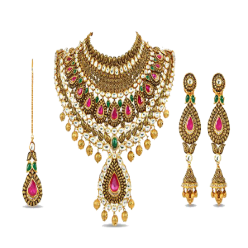 This exquisite gold-plated necklace set is a masterpiece of Indian craftsmanship, combining the elegance of Kundan with the vibrant colors of Meenakari.